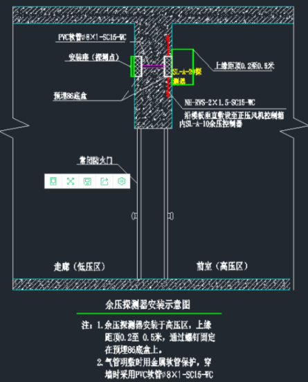 余壓探測器:也叫壓差控制器、余壓探測器、壓力傳感器等,如圖,壁掛安裝樓梯間、前室內(nèi)防火門那一側(cè)(上圖右上部分),氣流穩(wěn)定避開風(fēng)口的地方,距頂20~50公分,直接固定在預(yù)埋86盒上壁掛安裝。
