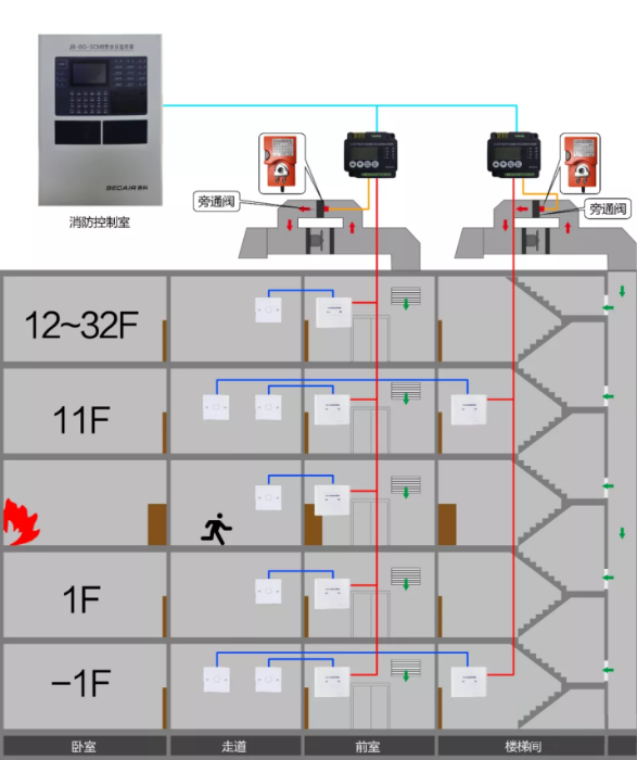 其中,余壓監(jiān)控器安裝在消控室內(nèi),余壓探測器安裝在電梯前室和樓梯走道,余壓控制器和風(fēng)閥控制器安裝在風(fēng)機控制柜。